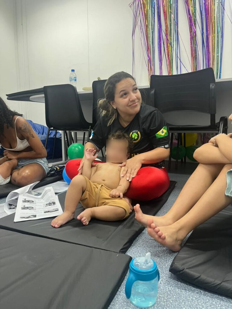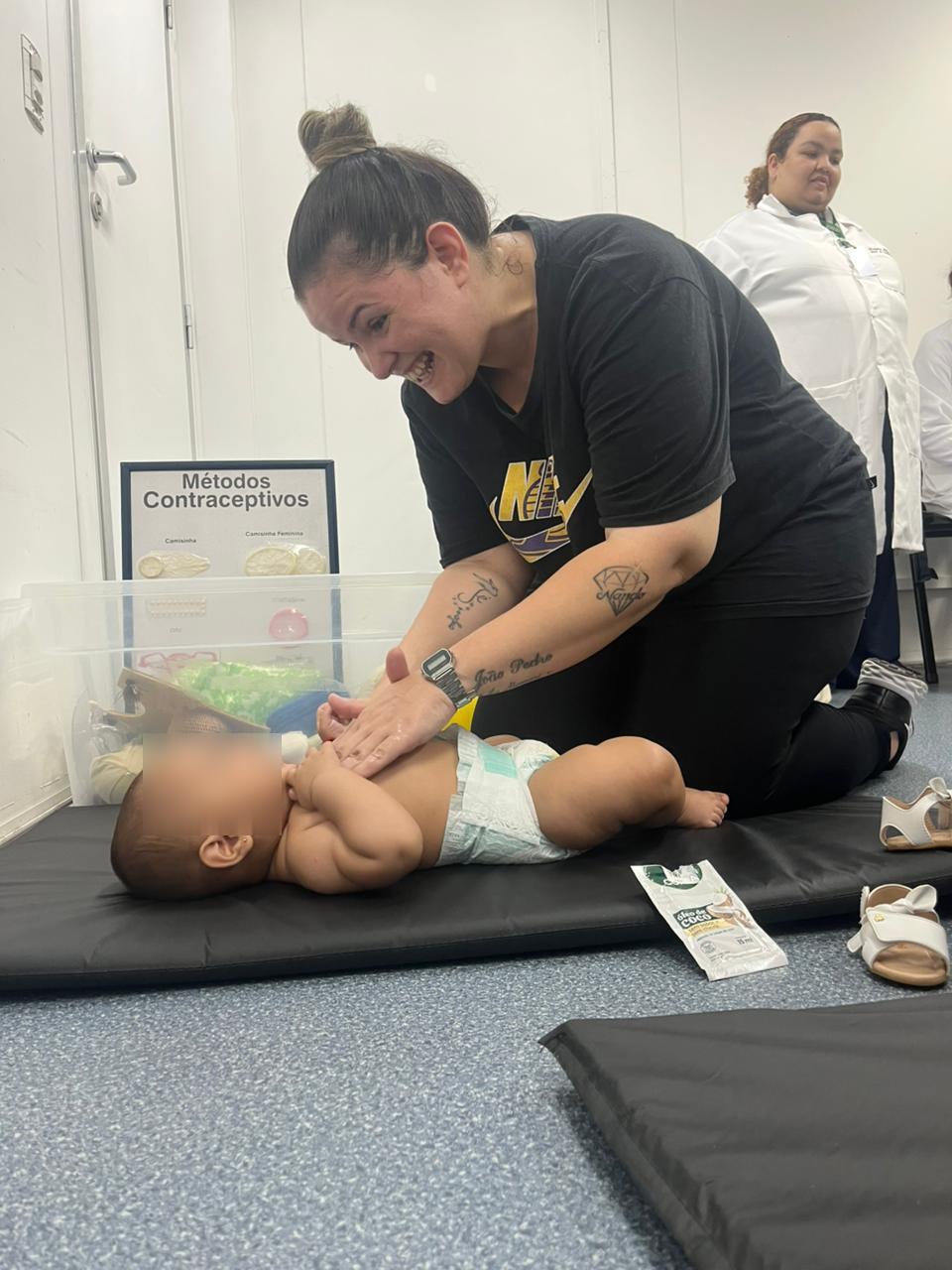 Durante o encontro, as participantes tiveram a oportunidade de vivenciar um momento especial que é a prática da shantala, técnica de massagem indiana voltada para bebês, ministrada pela enfermeira Celina. A atividade promove relaxamento, melhora do sono, alívio de cólicas e reforço do vínculo afetivo entre mãe e filho.