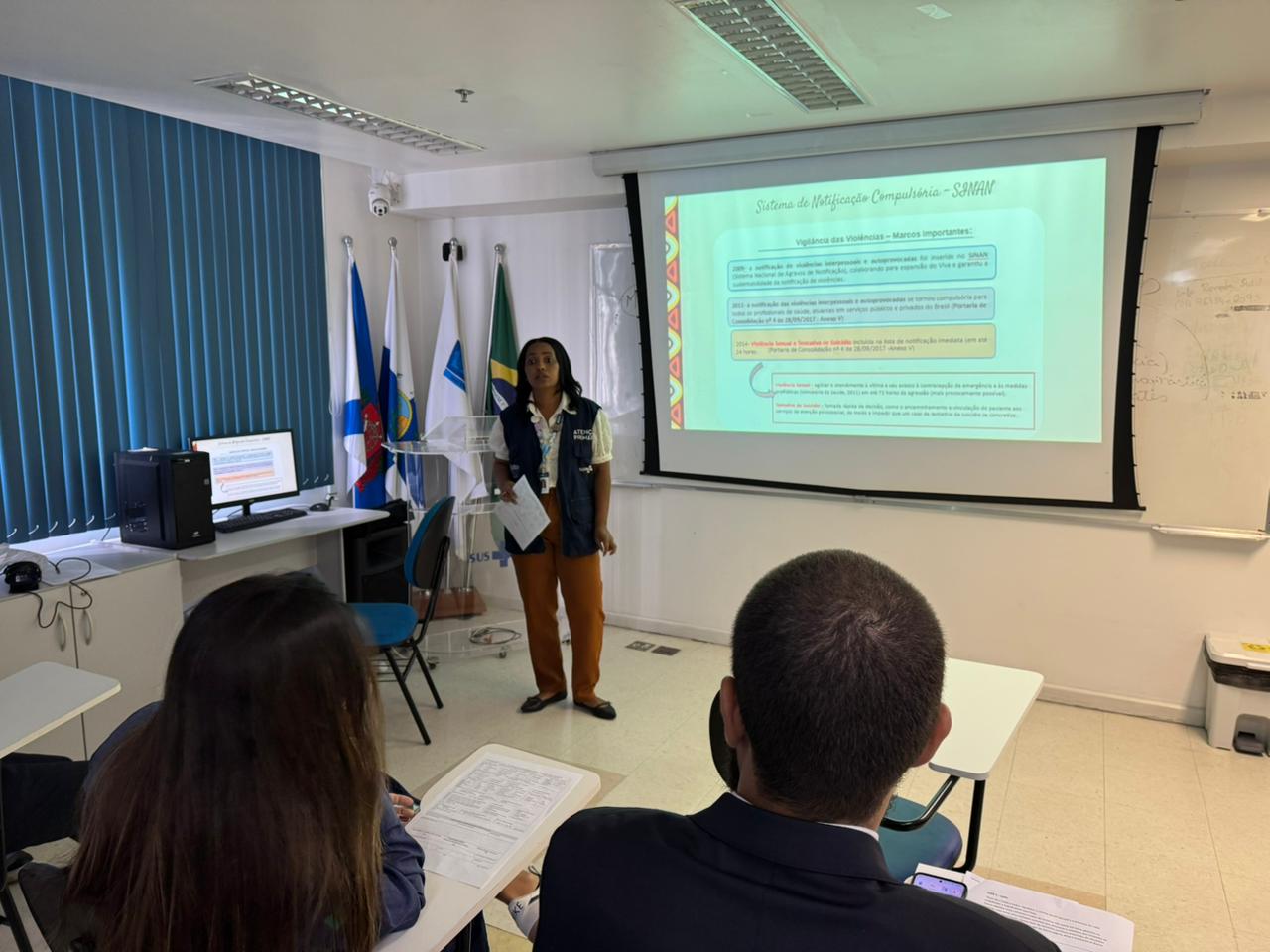 Durante a atividade, foi abordada a notificação de violência no Sistema de Informação de Agravos de Notificação (SINAN), instrumento do Ministério da Saúde (MS) utilizado para registrar casos de violência interpessoal e autoprovocada atendidos nos serviços de saúde. Foi ressaltado que a notificação é obrigatória e essencial para dar visibilidade às violências, orientar o planejamento de políticas públicas, fortalecer ações de prevenção e proteção às vítimas, além de subsidiar a vigilância epidemiológica e o enfrentamento das desigualdades raciais no âmbito da saúde pública.